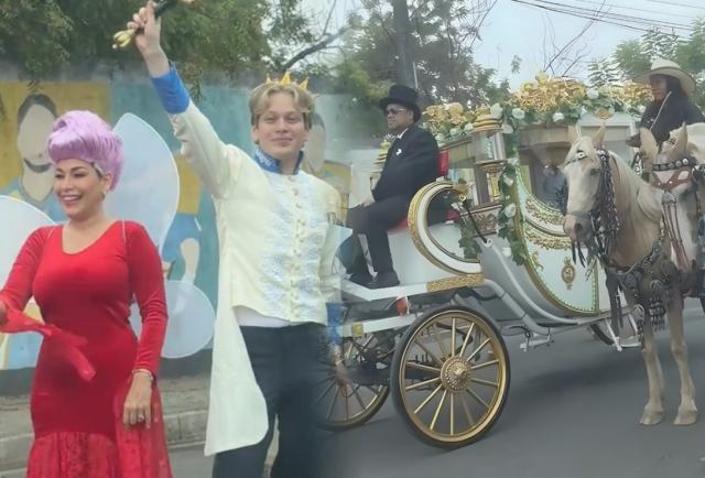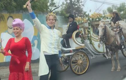 Fiel a su sello personal, Farah llegó a la cabecera cantonal montado en una carroza tirada por caballos, vestido como el Príncipe Encantador de la saga de películas animadas de Shrek. Pero no llegó solo. A su lado, en un rol protagónico, apareció su mamá —popular en TikTok como “Mamá Careve”— quien se robó parte del show caracterizada como el Hada Madrina, generando aplausos, risas y decenas de celulares grabando cada detalle.