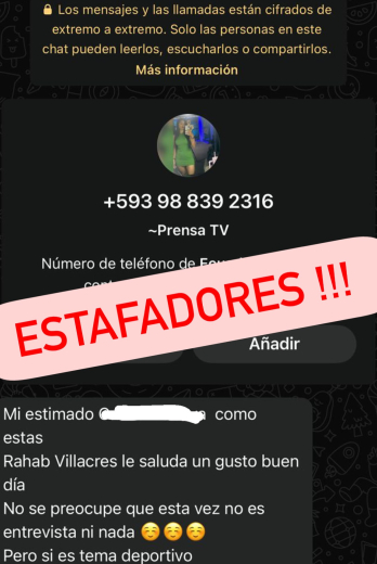 Villacrés aclaró que nunca solicitaría dinero a través de transferencias ni escribiría desde cuentas desconocidas, por lo que pide a la ciudadanía verificar la información antes de confiar en supuestos pedidos a su nombre. En sus redes está la constancia de las conversaciones y las capturas que le enviaron los perjudicados del dinero transferido. Los timadores además solicitaban equipos deportivos.