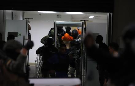 Gómez Quinde fue sacado del edificio de la Fiscalía con su rostro tapado con dos mascarillas negras; en cambio, las otras tres ppl cubrieron su cara con la camiseta naranja que vestían. Inmediatamente, fue subidos de vuelta a las tanquetas y arrancaron los vehículos para ir en dirección al norte de la ciudad, por la calle Antepara y luego la avenida Quito.
