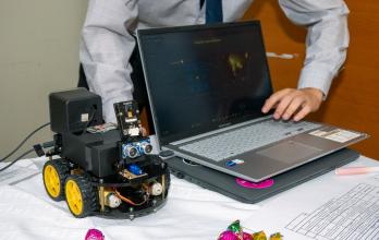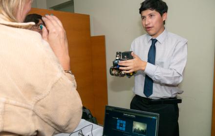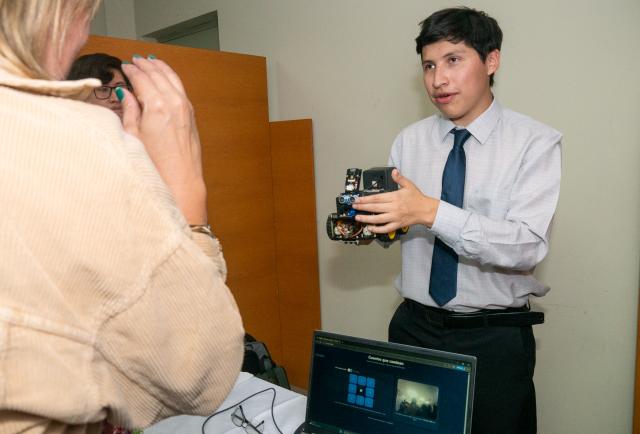 El carrito se mueve con timidez sobre el piso, pero lo que sorprende no son sus ruedas, sino su voz. A través de dos cámaras que simulan ojos, el juguete observa a quienes lo rodean y comienza a narrar lo que ve. “Martín, un joven de camisa negra y gafas, tenía su teléfono como si fuera un artefacto mágico…”, dice. El autor de este curioso invento es Erick Flores, un estudiante de Telemática.