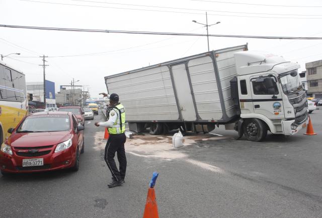 Según informó un agente de la Comisión de Tránsito del Ecuador (CTE), el conductor perdió el control tras sufrir daños en el tren posterior y en las llantas, quedando el camión detenido en medio de la vía, obstruyendo el paso y desplazándose parcialmente hacia su costado derecho.