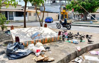 Los vecinos lo llaman ‘el redondel del basurero’, y con razón: colchones viejos, camas descascaradas, fundas abiertas, escombros, restos de comida fermentándose bajo el sol. Entre esa mezcla corretean perros flacos y palomas que picotean, disputando cada trozo.