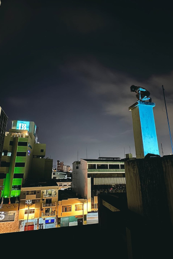 Adentro solo hay concreto sin enlucir, restos de escombros y un eco que rebota en estructuras apagadas. Nada más. Nada menos. Para ellos es un parque de juegos: pasillos sin terminar, vigas expuestas, huecos oscuros. Recorren todo hasta llegar al techo. Desde la azotea, Guayaquil se abre ante sus ojos como un mapa de luces, con vista al malecón Simón Bolívar y al ‘manso Guayas’.