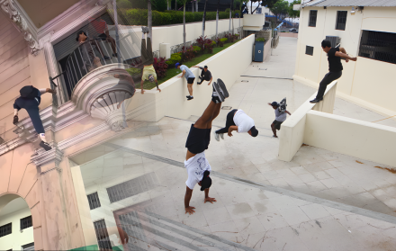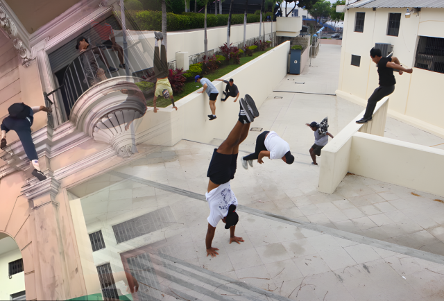 Guayaquil, dice, tiene algo que otras ciudades no: estructuras amplias, muros útiles, áreas públicas sin barreras. Para él y su grupo, es un gimnasio al aire libre.