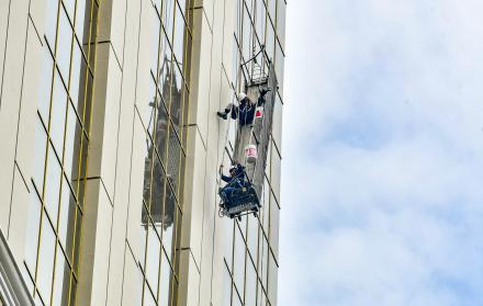 #Guayaquil | En la Av. 9 de Octubre y Malecón, se recibió la alerta de personas colgando de un andamio en un edificio del sector.