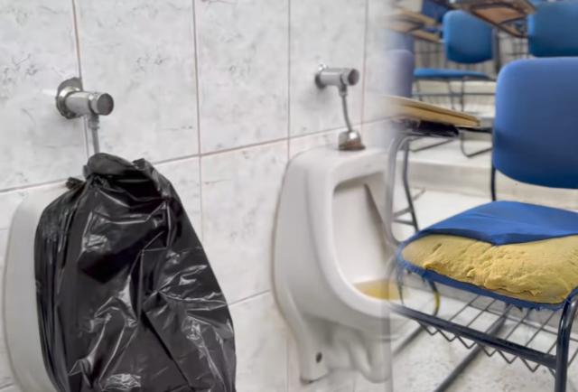 La grabación no se limita a los baños. En otra secuencia, las cámaras recorren un aula con bancas desgastadas: telas rasgadas que dejan ver la esponja, estructuras oxidadas y pupitres reducidos a esqueletos metálicos.