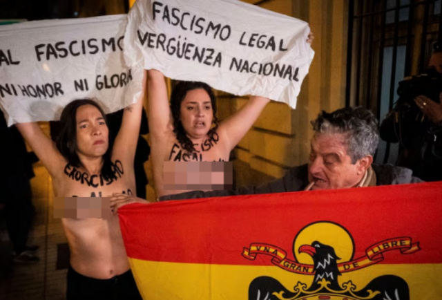 En medio de esta multitud, la protesta irrumpió de forma abrupta. Dos activistas de Femen atravesaron la entrada con el torso desnudo, mostrando en sus cuerpos y pancartas los lemas “Fascismo legal, vergüenza nacional” y “Al fascismo, ni honor ni gloria”.