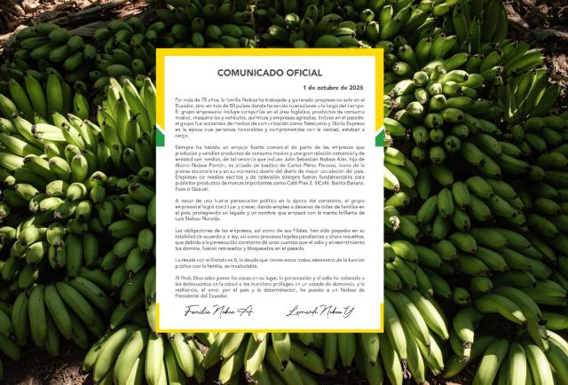 En un comunicado oficial difundido por la familia Noboa este miércoles 1 de octubre de 2025, finalmente respondieron a las críticas surgidas tras la fuerte reducción de la deuda tributaria de la Exportadora Noboa con el Servicio de Rentas Internas (SRI).