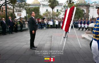 Antes del encuentro presidencial y de Gabinete Binacional, Jerí y sus ministros participaron en la entrega de una ofrenda floral en la Plaza de la Independencia (también conocida como Plaza Grande).