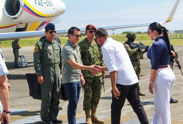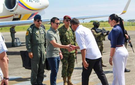 El mandatario arribó pasadas las 10h00 al aeropuerto Carlos Concha Torres, acompañado por los ministros del Interior, John Rainberg, y de Defensa, Gian Carlo Loffredo. A su llegada fue recibido en un acto protocolario por el gobernador de la provincia, Juan Jaramillo; la prefecta Roberta Zambrano, autoridades locales y representantes del alto mando policial y militar.