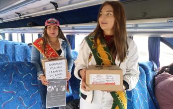 Las reinas de la parroquia y la de Pelileo, Valentina Garzón, recorren los barrios e incluso se suben a los buses para solicitar ayuda económica en la cruzada solidaria para las víctimas del siniestro, que ocurrió la tarde del lunes 7 de agosto de 2023, en el sector El Chaupi, vía Baños-Pelileo.