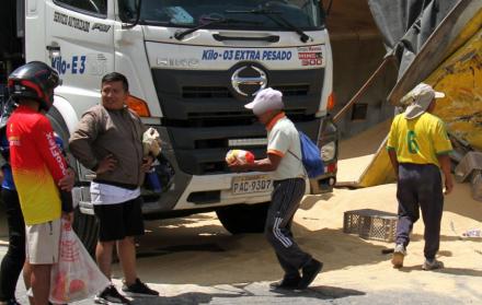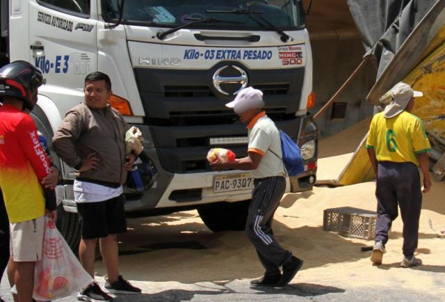 Tras el siniestro que dejó tres muertos y ocho heridos en Quito, moradores aprovecharon para llevarse costales de alimento para aves y varios pollos