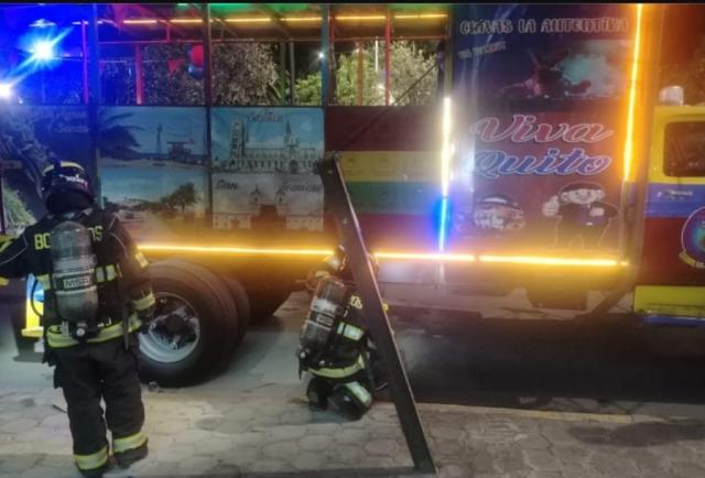 Desde el Cuerpo de Bomberos de Quito solo se informó que "el incendio de un camión tipo chiva fue controlado por el propietario utilizando un extintor de polvo químico seco. En este caso no realizamos intervención, ya que a nuestra llegada el conato ya fue controlado".