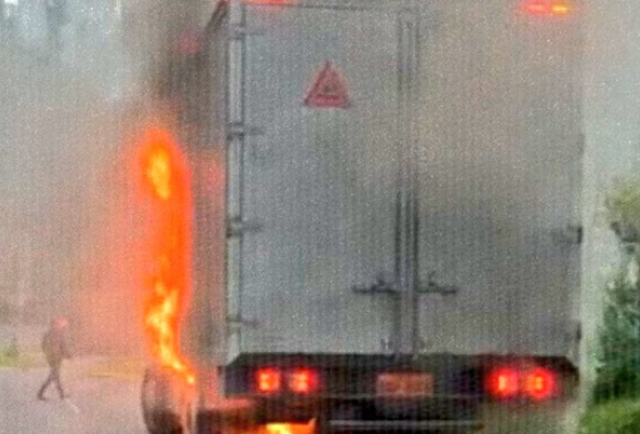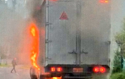 En videos difundidos en redes sociales se observa al camión estacionado a un costado de la vía, completamente envuelto en llamas.