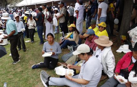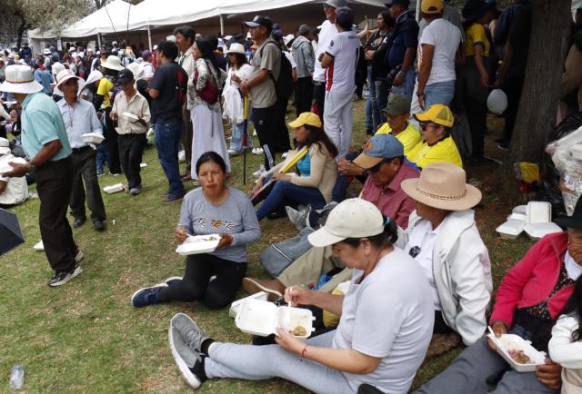 El aroma del seco de chancho (plato insignia del encuentro) se mezclaba con los cánticos de apoyo al mandatario. “Aquí estamos con Noboa, porque queremos un país que trabaje, no que pare”, decía una de las asistentes, quien recibía un plato de alimentos.
