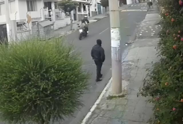 Uno de ellos, con casco y vestimenta oscura, se baja rápidamente, avanza hacia el joven y lo apunta, lo intimida con la mano extendida. La víctima levanta las manos, retrocede mientras, al parecer, le buscan su teléfono o algo de valor, pero el asaltante no habría encontrado algo. El hecho ocurre en pocos segundos y el delincuente regresa a la moto, que arranca de inmediato.