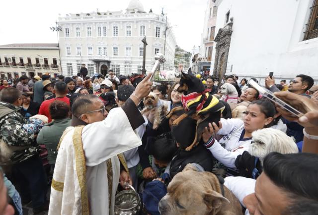 Perros, gatos, conejos, hámsteres y hasta gallos fueron junto a sus tutores la tarde de este sábado 4 de octubre del 2025 a la Plaza de San Francisco, en el Centro Histórico de Quito para recibir la bendición del padre.