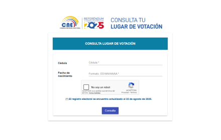 El Referéndum y Consulta Popular 2025 se realizará el domingo 16 de noviembre y 13,9 millones de ecuatorianos están habilitados para participar. El Consejo Nacional Electoral (CNE) dispone de un sistema en línea para que cada elector verifique su lugar de votación, número de junta y dirección del recinto (provincia, cantón, parroquia y zona). Te explicamos cómo consultarlo, qué sanciones implica no presentarse y qué deben saber quienes fueron designados como miembros de junta receptora del voto.