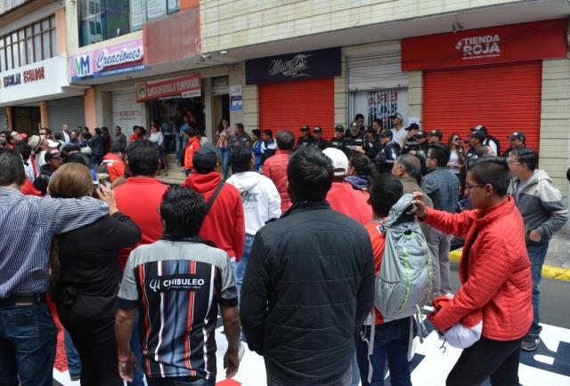 Estaban enojados. Un grupo de hinchas del Técnico Universitario llegaron con banderas y tambores hasta el centro de Ambato, provincia de Tungurahua y en plantón exigían la salida de los directivos del ‘rodillo rojo’.