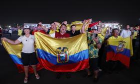 Alrededor de 500 hinchas ecuatorianos cantan, bailan y gritan en una de las plazas más grandes de Doha como previa al inicio del Mundial