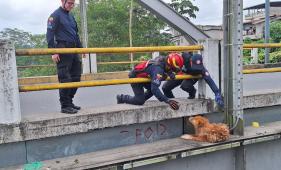 Quinindé: Bomberos rescatan un perro al borde del puente sobre el río Blanco