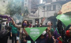Grupos feministas llegaron hasta los exteriores de la Corte Constitucional, en Quito, mientras el pleno analizaba la inconstitucionalidad del artículo 150 numeral 2 del COIP.