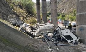 Tragedia en el Paso Lateral sur de Ambato. Un camión que transportaba leche cayó debajo del puente