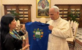 Patrici Gualinga entregó al Papa León XIV una camiseta del "No" en el Vaticano, un gesto simbólico antes de la consulta popular del 16 de noviembre