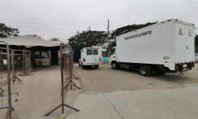 El acceso permanece restringido. En los exteriores aguardan camiones cargados con alimentos.