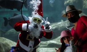Un Santa acuático ofrece regalos entre pirañas en un zoológico de Guadalajara