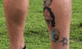 Damián Díaz lleva un tatuaje de Diego Maradona en su pierda derecha